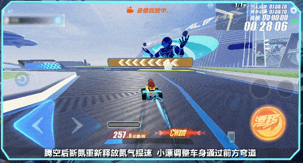此处飞跃点落地前重开氮气并向右小漂过弯,借助腾空进行氮气持续,在意前哨近谈,鼎新好路子后提前向右弹射甩尾参预第二圈。